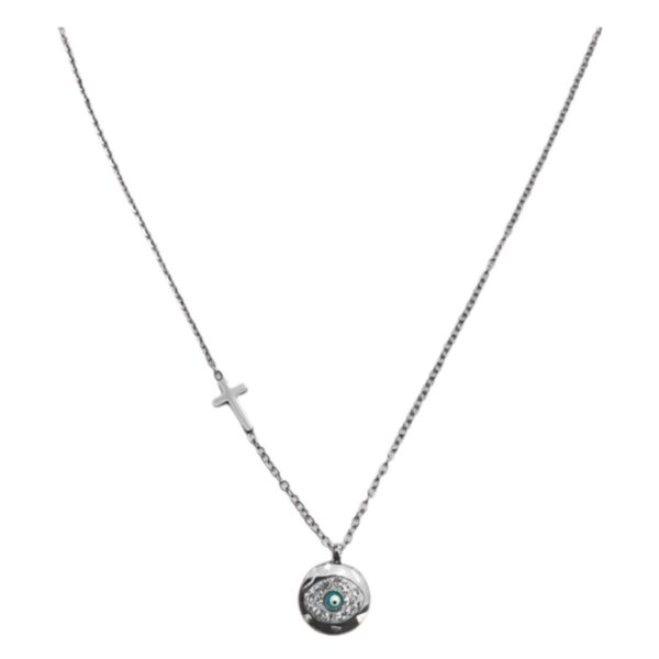 Κολιέ Stainless Steel Μικρό Μάτι με Σταυρό Strass Ασημί